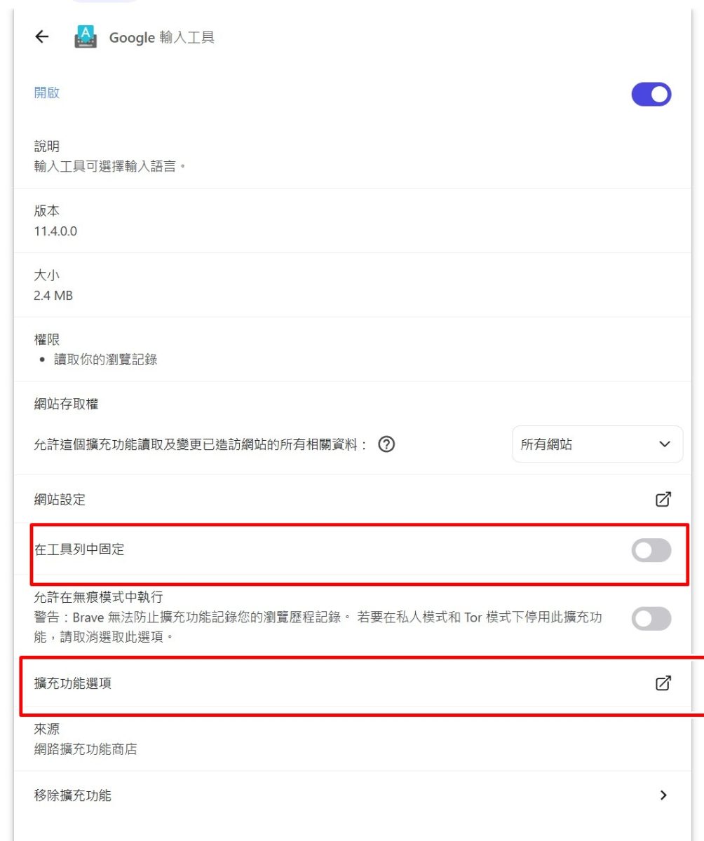 安裝完成之後,請先到擴充程式選項去設定【在工具列中固定】,並打開【擴充功能選項】