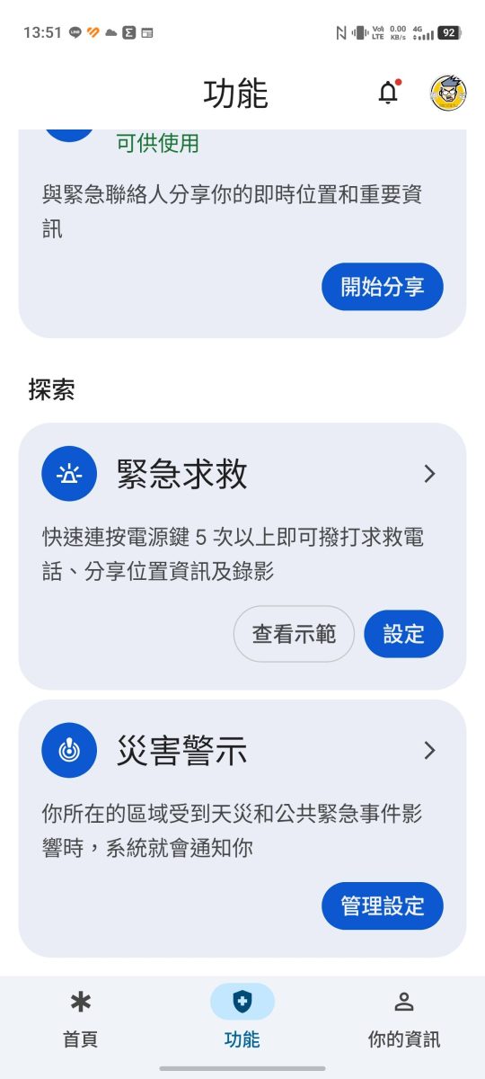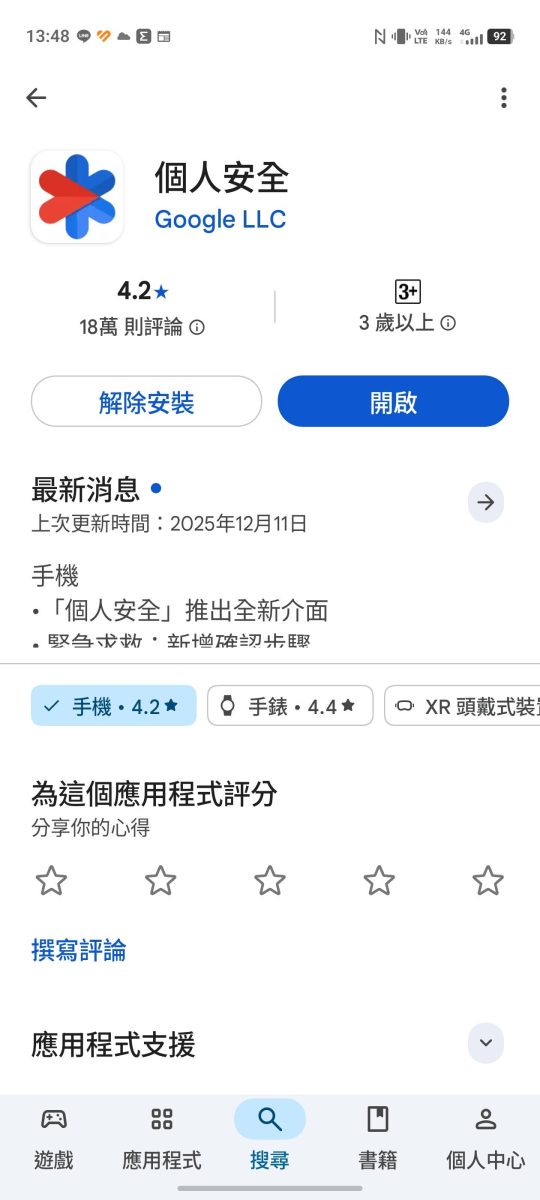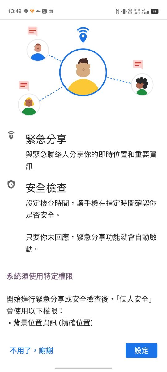 適用對象: Pixel 系列手機內建,其他 Android 手機可從 Play 商店下載 「個人安全 (Personal Safety)」 App。