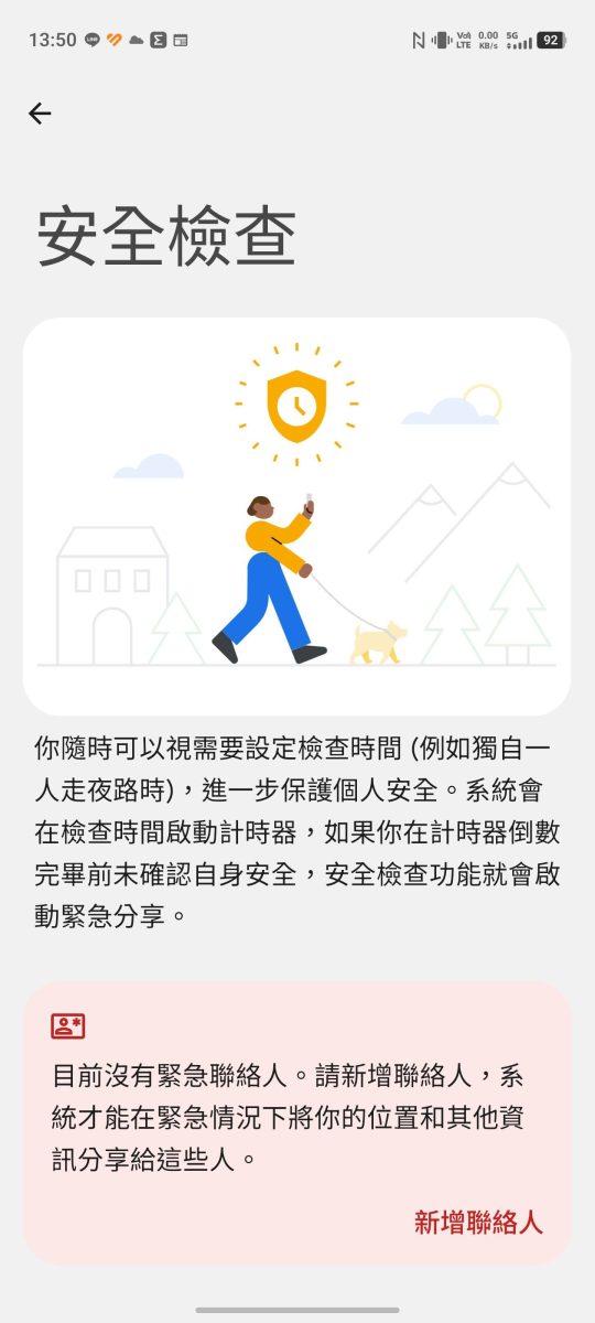 安全機制: 若時間到了你沒有「確認安全」,手機會自動將你的即時位置分享給緊急聯絡人。