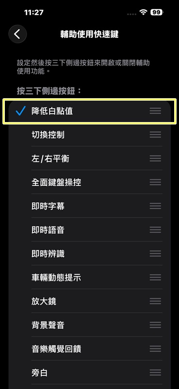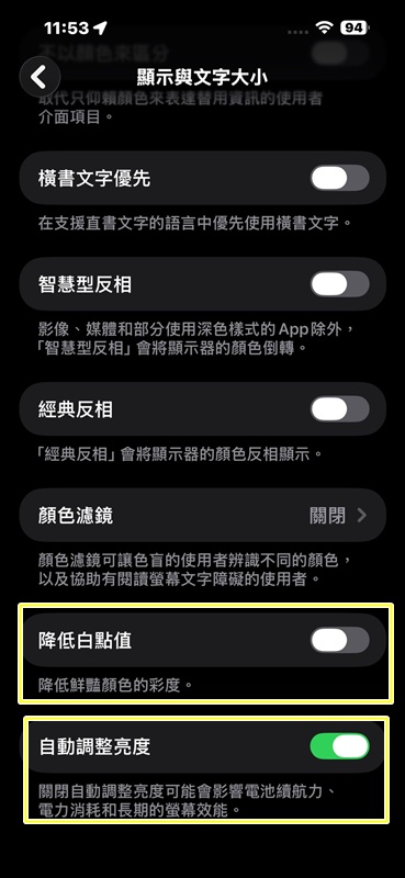 降低白點值是在iPhone 的輔助使用設定中調整螢幕亮度的一種方法,可將螢幕上最亮的顏色變得更柔和,減少眼睛疲勞和眩光。