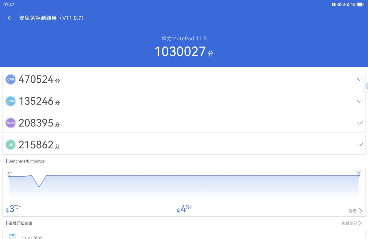 處理器採用麒麟Klrin T82B ,安兔兔不免俗跑一下,效能輕鬆超過百萬