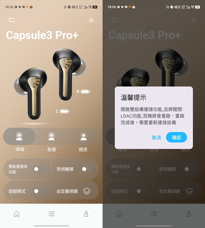 降噪方面,Capsule3 Pro+ 支援最高 -45dB 主動降噪。在開啟降噪模式後,耳機會透過 AI 演算法分析環境噪音與配戴狀況,並自動調整最佳降噪效果。