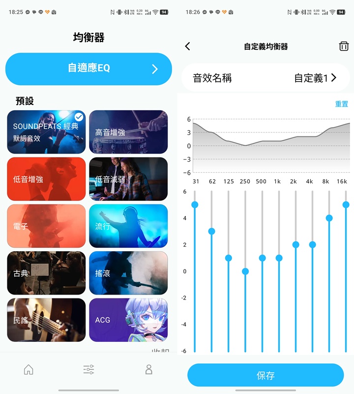 搭配專屬 App 也可以進一步調整聲音風格,例如使用 自適應 EQ 讓系統依照聽力特性自動調整,因為有些人左右耳聽力不同,因此可以客製化屬於自己的聲音。或透過多種預設 EQ 與自訂等化器,預設推薦的經典EQ模式就蠻適合聽KPOP歌曲,不過我個人有偏愛的調整 (如下圖)